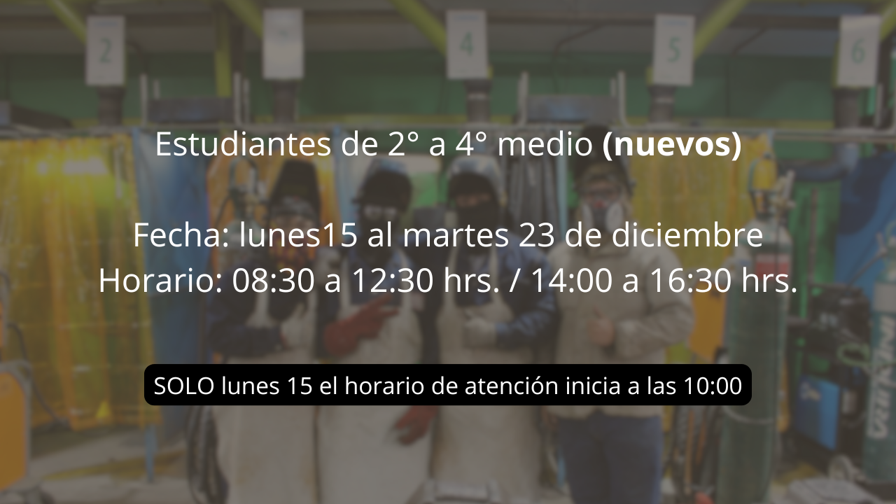 Pueden matricular hasta el martes 23 de diciembre (fecha entregada por MINEDUC). Los días 9 y 10 pueden conocer al profesor jefe, desde el 11 de diciembre en adelante, el proceso es directamente en inspectoría.